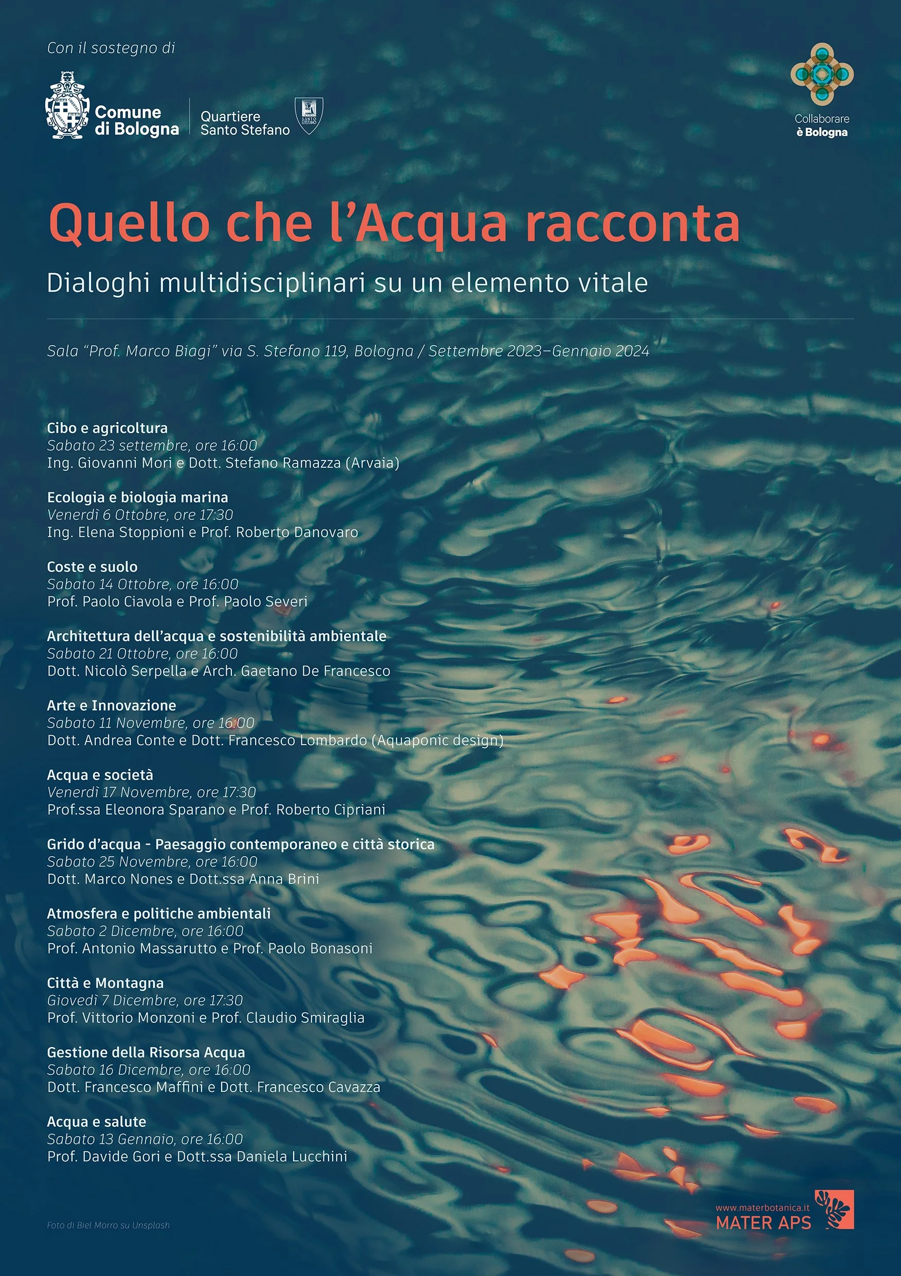 Quello che l’Acqua racconta è un ciclo di conferenze organizzato da Mater APS, con il sostegno di Comune di Bologna | Quartiere Santo Stefano.